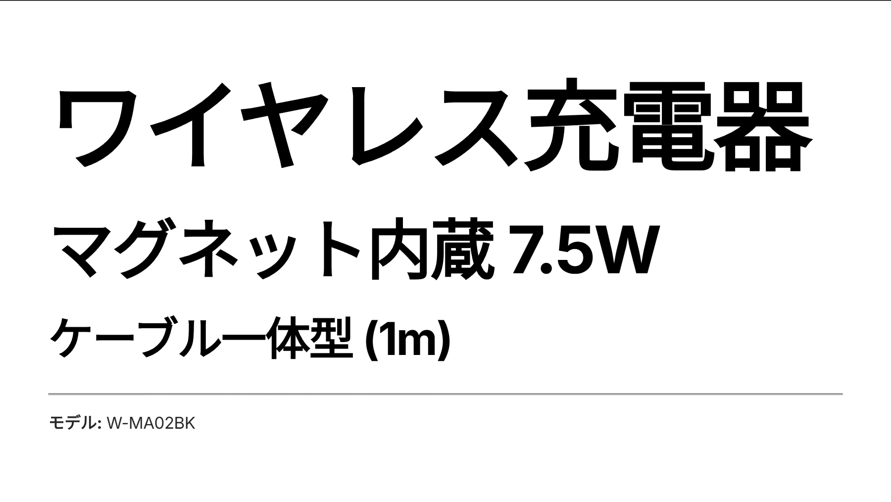 ワイヤレス充電器 マグネット内蔵 7.5W ケーブル一体 (1m) ブラック W-MA02BKのスペック