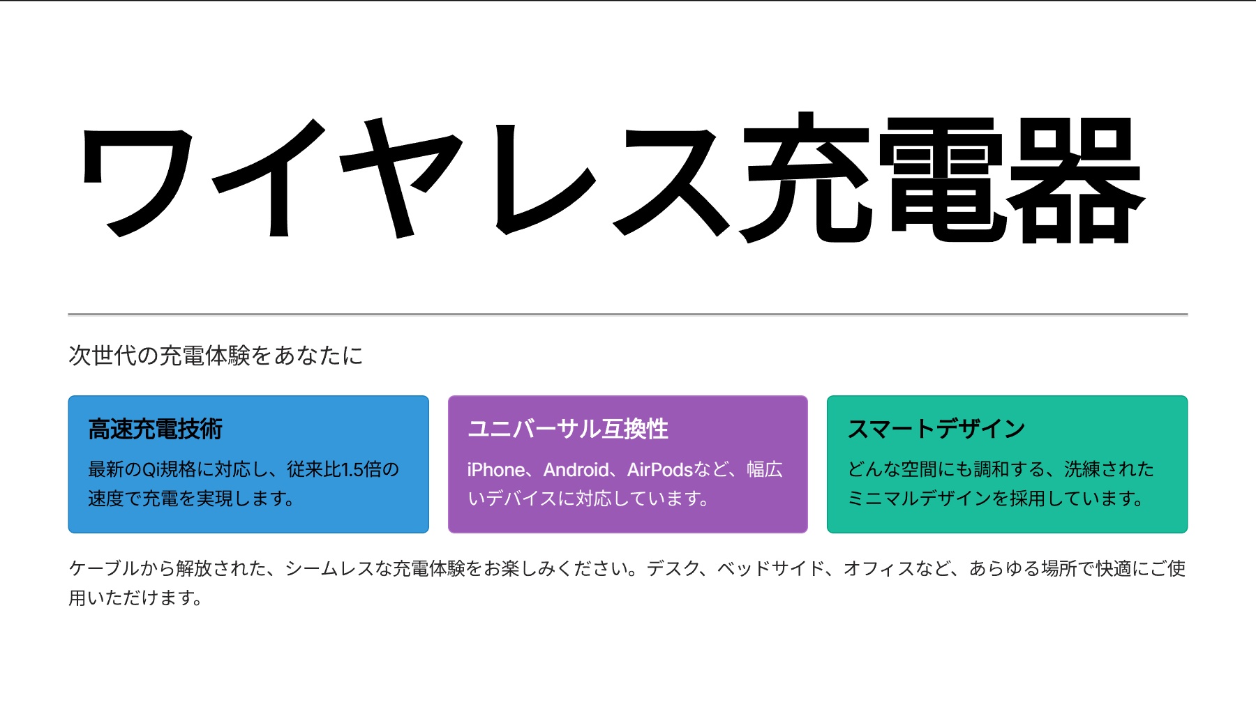 ケーブルの抜き差しから解放されたい方、デスクやベッドサイドをすっきりさせたい方におすすめです。置くだけで手軽にスマートフォンを充電したい方や、信頼できる日本のブランド製品を使いたい方にぴったりの一台です。