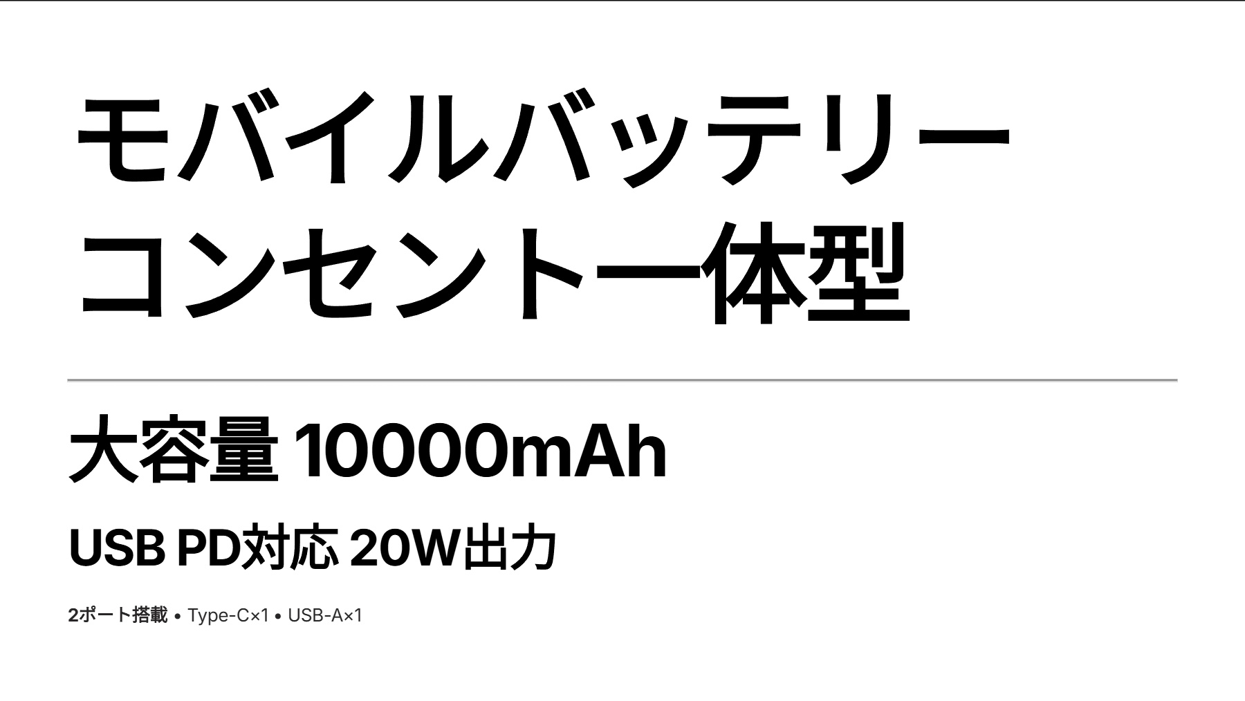 このモバイルバッテリーは、コンセントと一体になっているから充電器いらず!10000mAhの大容量でスマホをしっかり充電でき、USB PD対応の20W出力でサッと急速チャージ。Type-CとUSB-Aの2ポート搭載で、どんな機器もまとめて充電できる頼れる一台です。 -