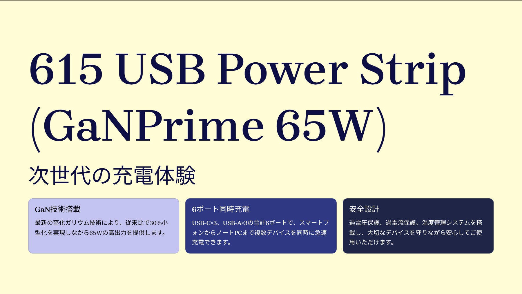 Ankerの「615 USB Power Strip (GaNPrime 65W)」は、ノートPCも充電できるパワフルな65W出力を、手のひらサイズのコンパクトボディに凝縮した多機能充電器です。USB-Cポート2つとUSB-Aポート1つを搭載し、これ一つで様々なデバイスを同時に急速充電できます。 -