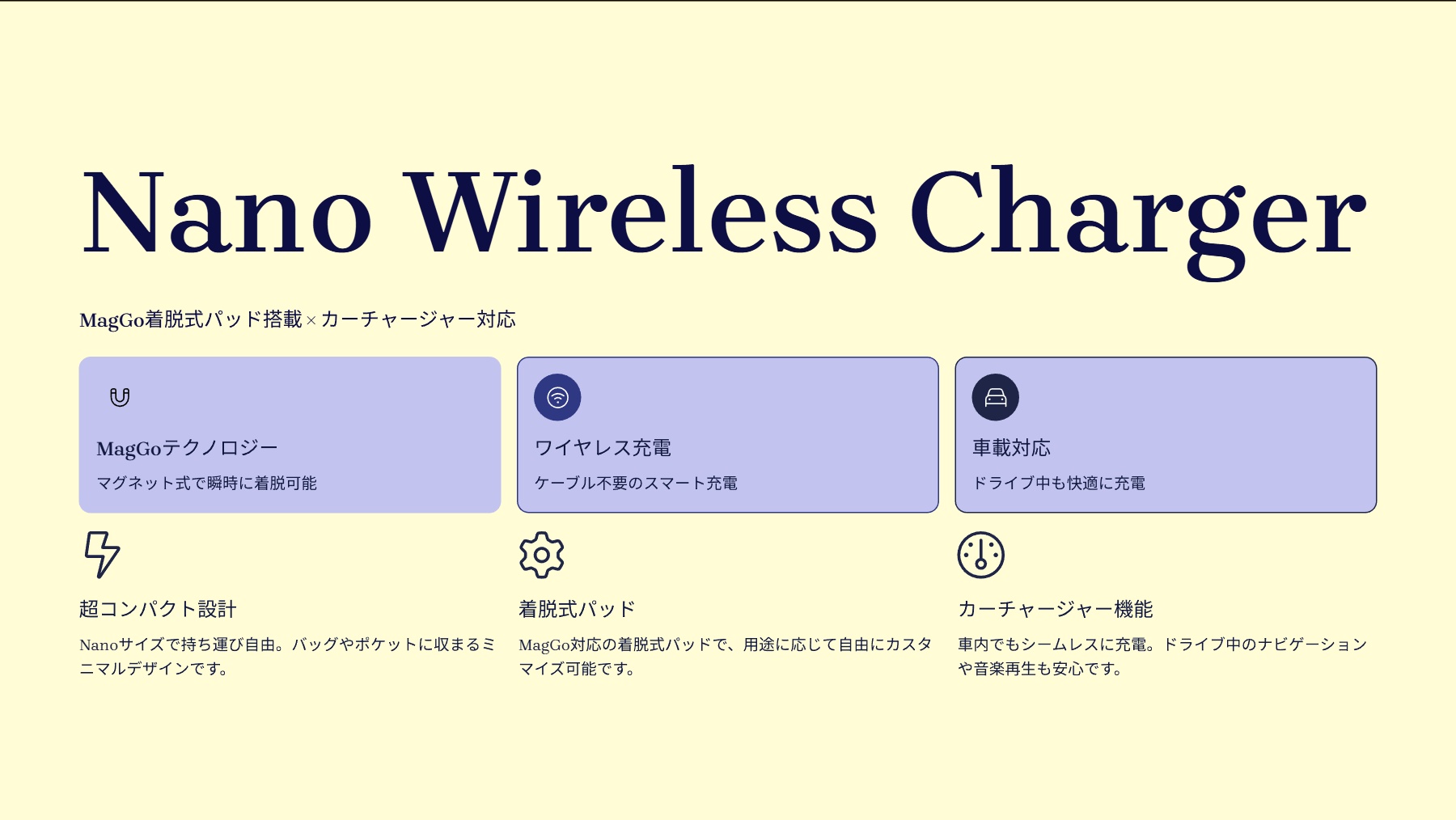 Nano Wireless Charger (MagGo, 着脱式パッド) with Car Charger