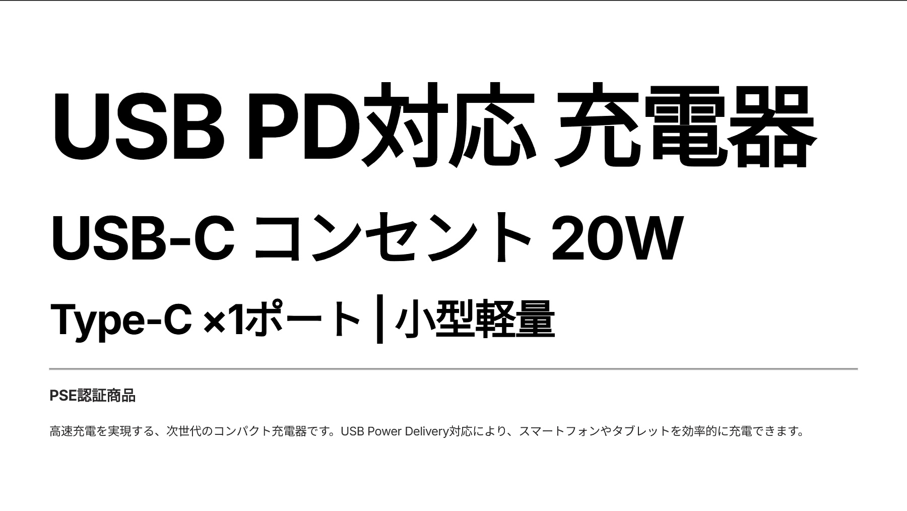 USB PD対応 充電器 USB-C コンセント 20W Type-C ×1ポート 小型軽量 PSE認証商品