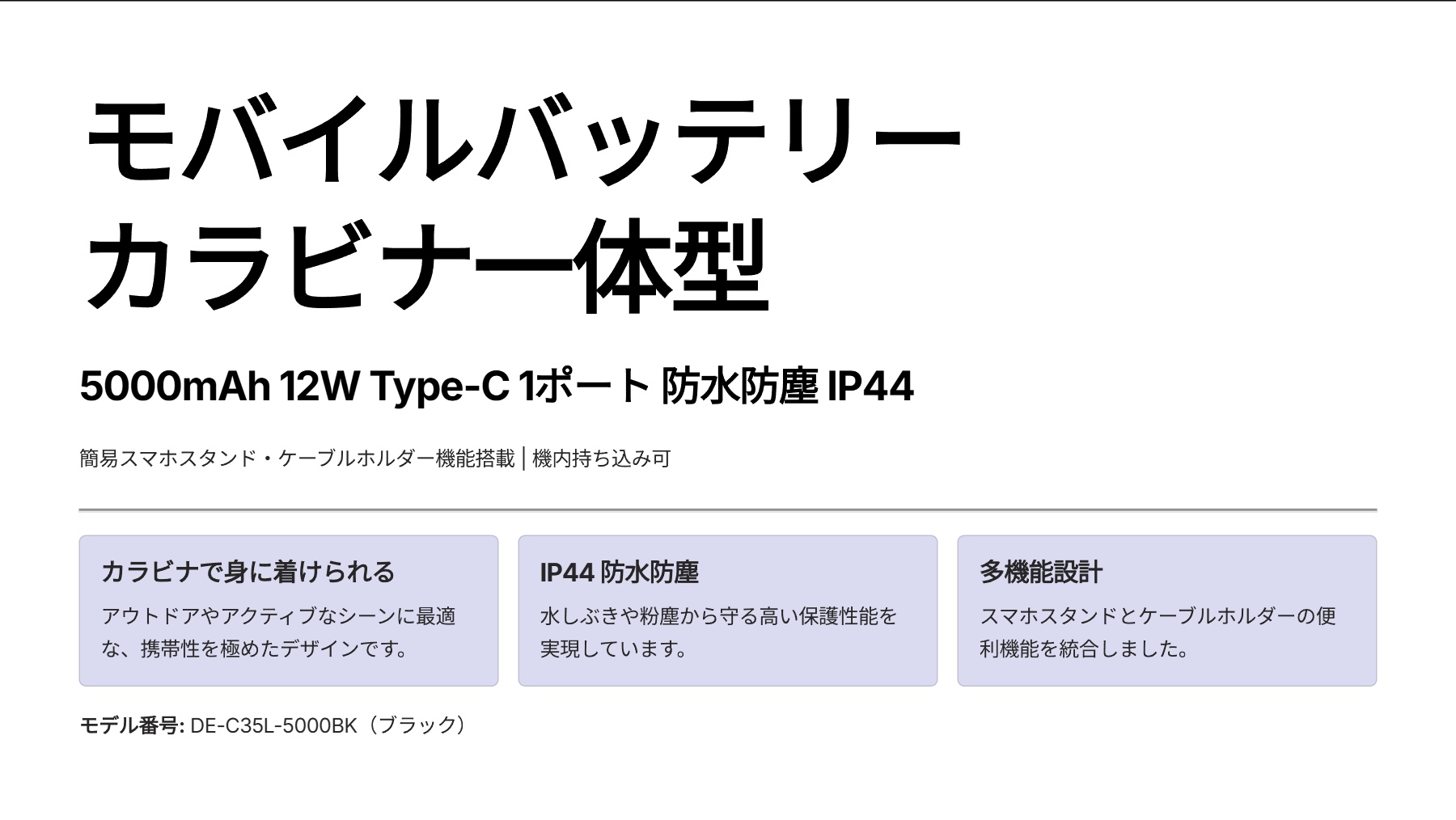モバイルバッテリー カラビナ一体型 5000mAh 12W Type-C 1ポート 防水 防塵 IP44 簡易スマホスタンド ケーブルホルダー 機内持ち込み可 [カラビナで身に着けられる] ブラック DE-C35L-5000BK