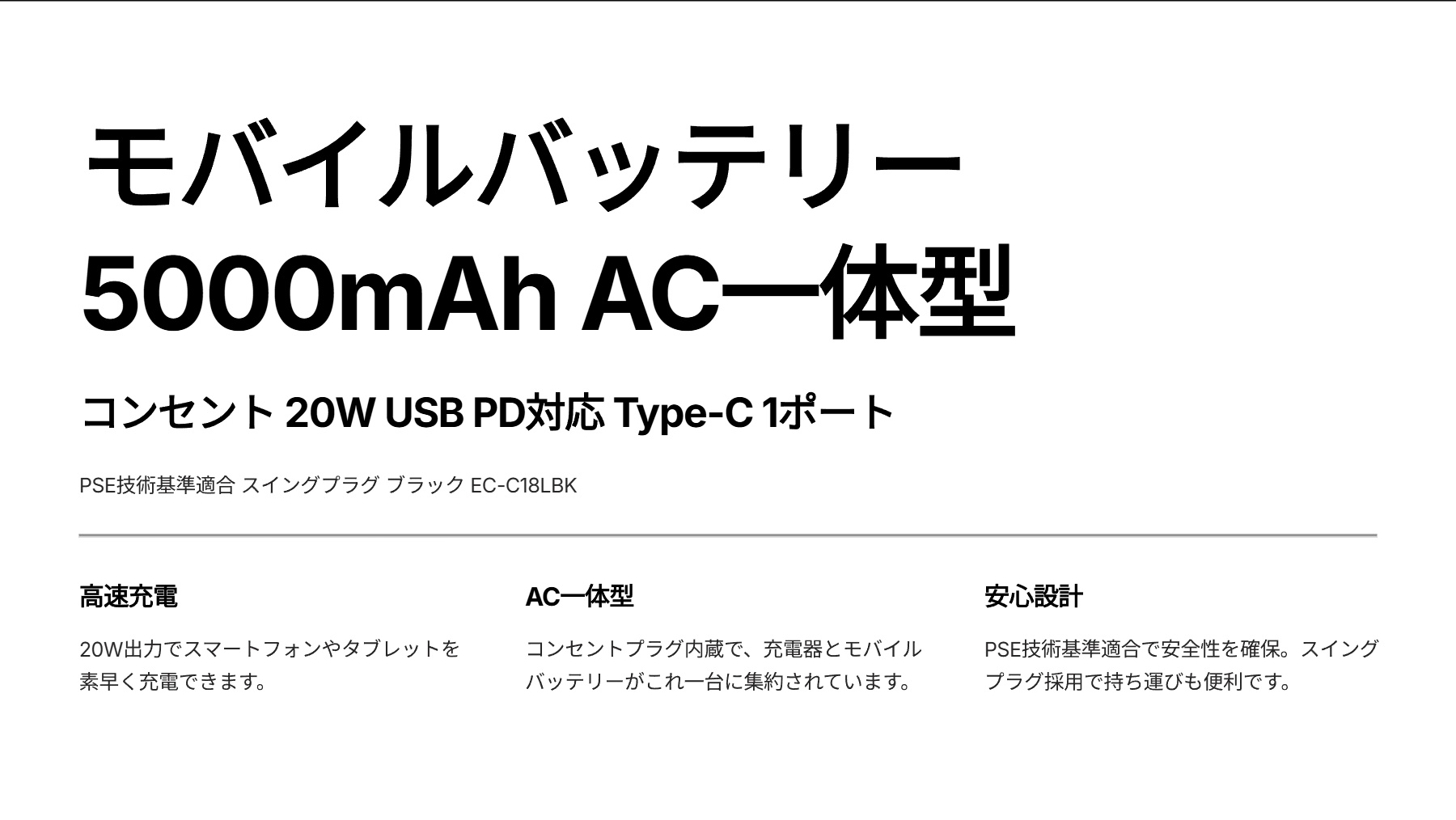 モバイルバッテリー 5000mAh AC一体型 コンセント 20W USB PD対応 Type-C 1ポート PSE技術基準適合 スイングプラグ ブラック EC-C18LBK