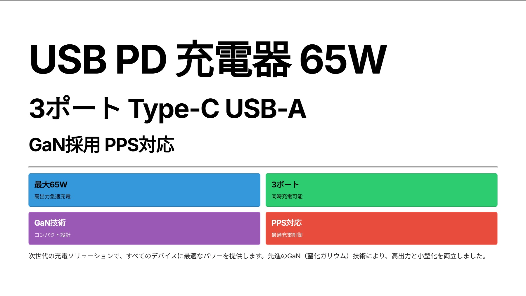 USB PD 充電器 65W 3ポート Type-C USB-A GaN採用 PPS対応のスペック