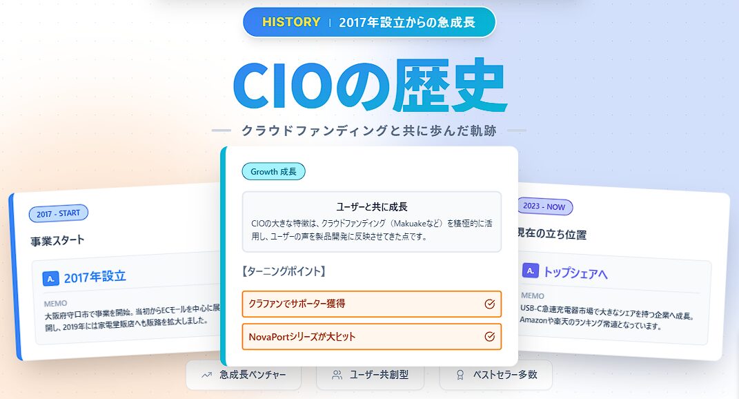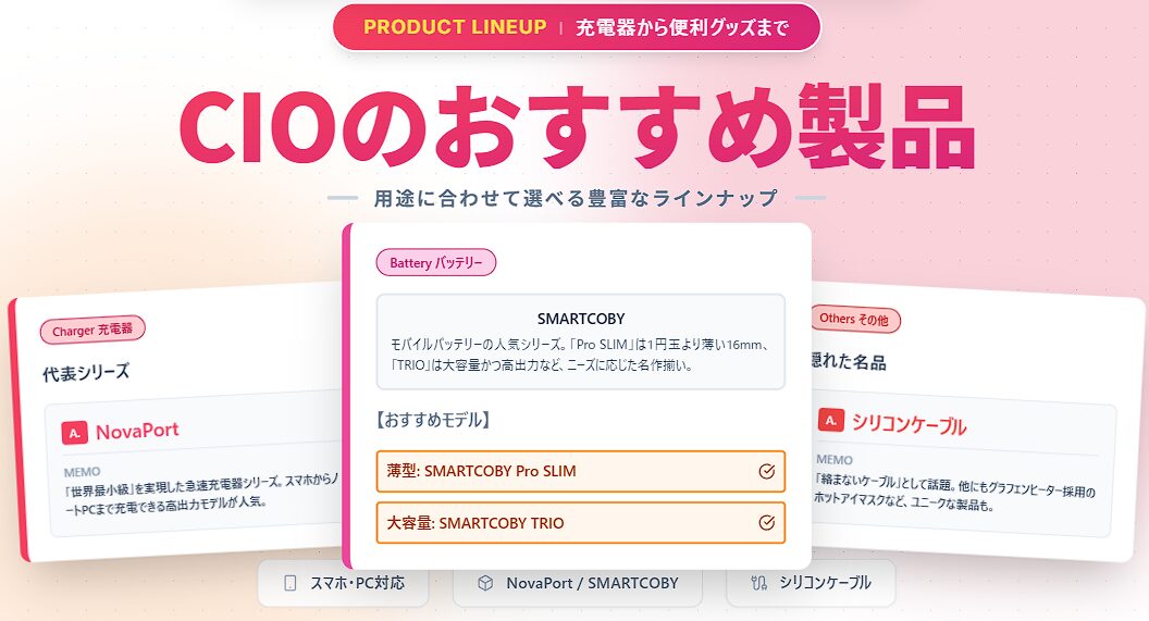 短期間で信頼を築き上げた背景には、ユーザー目線を大切にした製品づくりがあります。充電器やモバイルバッテリーを探しているなら、ぜひCIOのアイテムをチェックしてみてくださいね!