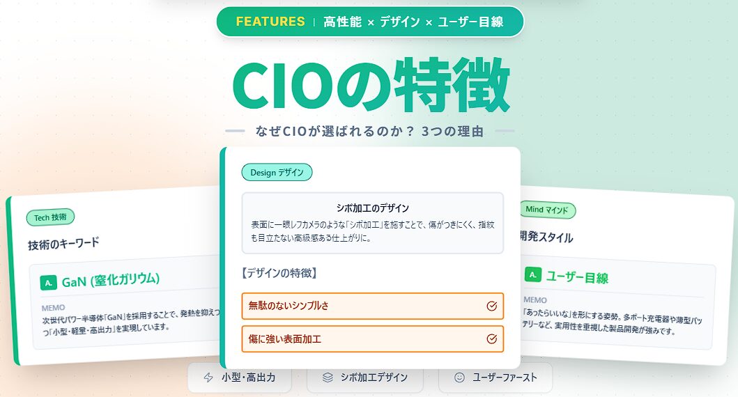 CIOは日本発のガジェットメーカーで、コンパクトかつ高性能な製品が特徴です。