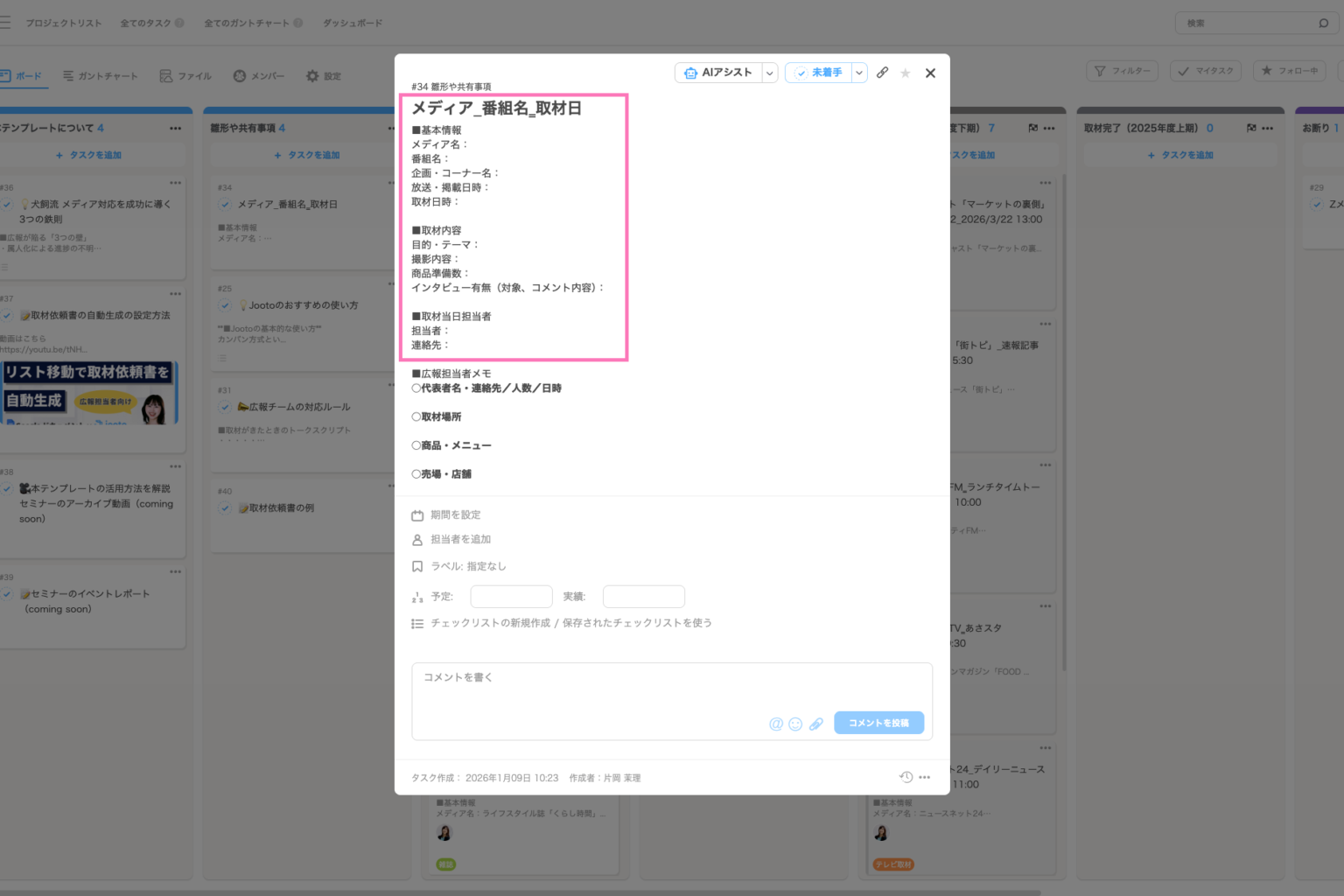 Jootoの「有識者監修テンプレート」は、プロの仕事の進め方をそのまま使えるテンプレートです。広報業務のように属人化しやすく、社内外の調整が複雑な業務においても、タスクとして可視化・共有することで、チーム全体で進捗を把握しながら業務を進められる環境づくりを支援します。