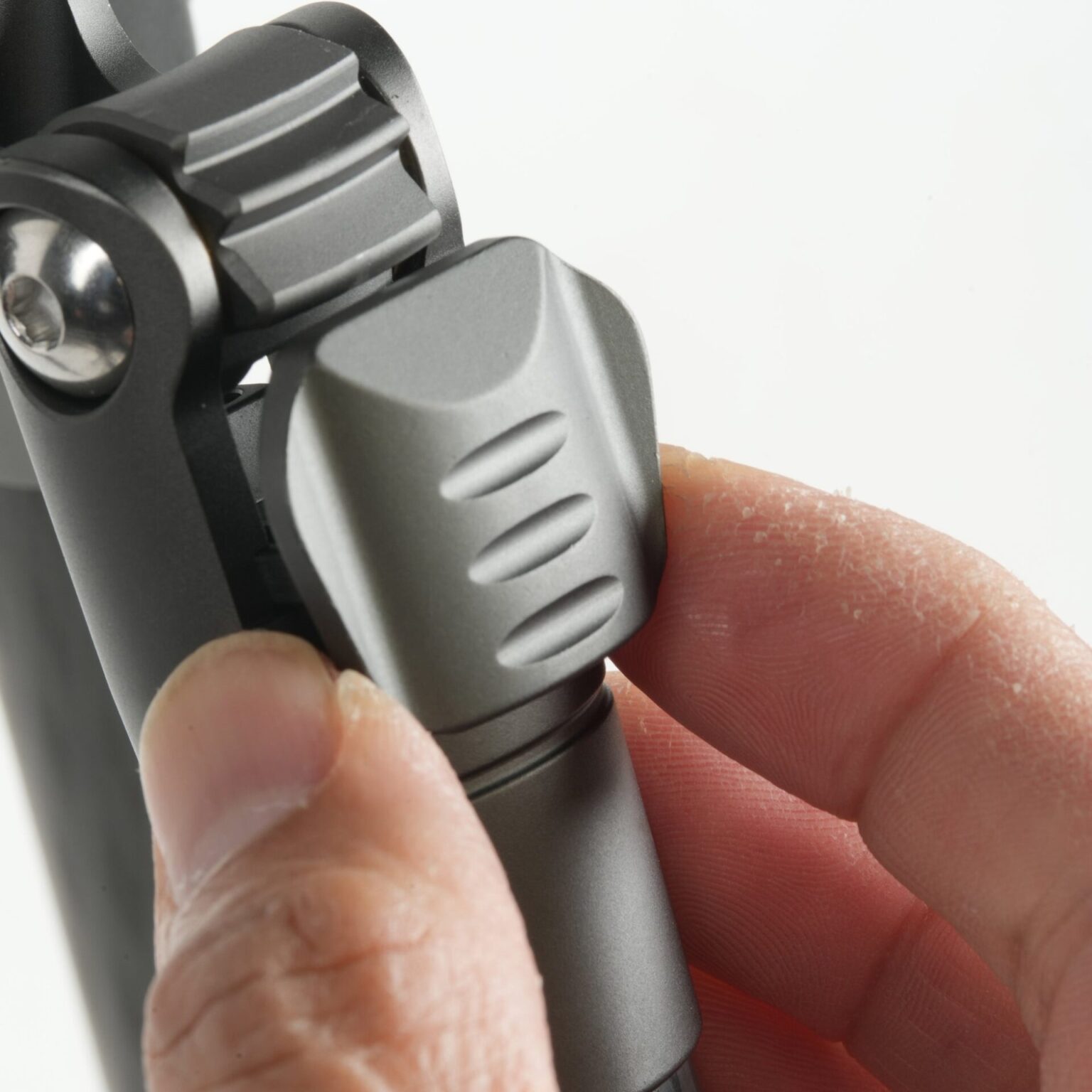 本体の三脚「脚3本とエレベーターを支える部分」には、アルミ削り出しパーツを採用しています。肉抜き加工により軽量化を図り、携帯時の負担を軽減しています。